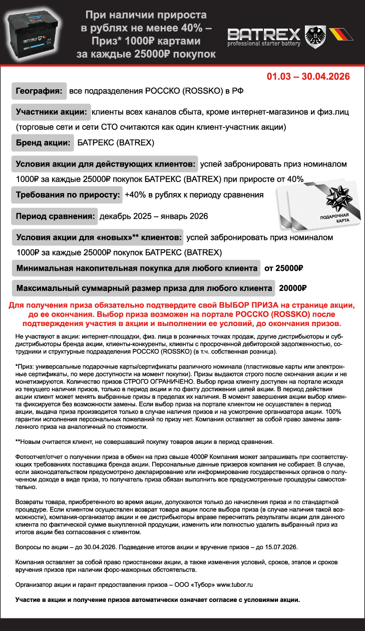 01.03 – 30.04.2026 Акция «При наличии прироста в рублях не менее 40% – Приз* 1000₽ картами за каждые 25000₽ покупок БАТРЕКС (BATREX)»